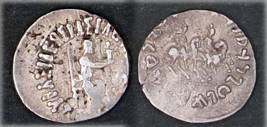 | Description / विवरण | Descrpn./Obv Zeus enthroned half right, holding winged Nike and long sceptre; Greek legend, Basileos Basileon Megalou / Azilisou. Descrpn./Rev Dioscuri, holding long spears and palms, mounted on horse galloping right, Kharoshthi legend, Maharajasa Rajadirajasa Mahatasa Ayilishasa |