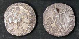 | Description / विवरण | Descrpn./Obv Diademed king on horseback to r., wearing armour and holding spear; Greek legend, Basileos Basileon Megalou / Onunou. Descrpn./Rev Zeus radiate, standing facing, holding long scepter in left hand and thunderbolt in outstretched hand; Kharoshthi legend, Spalahoraputrasa dhramikasa / Spalagadamasa |