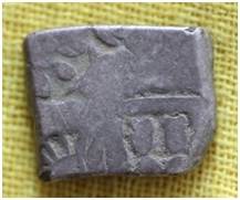 | Description / विवरण | The coin is rectangular in shape. Obverse Sun, Six armed wheel, two male figure. Reverse Taurines around a circle. |