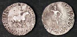 | Description / विवरण | Descrpn./Obv King holding whip, mounted on horse walking right; Greek legend, Basileos Basileon Megalou / Azilisou. Descrpn./Rev One dioscuros standing facing, holding long upright spear; Kharoshthi legend, Maharajasa Rajadirajasa Mahatasa / Ayilishasa |