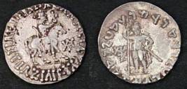 | Description / विवरण | Descrpn./Obv King holding whip, mounted on horse walking right; Greek legend, Basileos Basileon Megalou / Azilisou. Descrpn./Rev One dioscuros standing facing, holding long upright spear; Kharoshthi legend, Maharajasa Rajadirajasa Mahatasa / Ayilishasa |