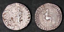 | Description / विवरण | Descrpn./Obv City goddess enthroned facing, but turned to right, with right hand extended holding torque and long scepter in left hand; Greek legend, Basileos Basileon Megalou / Mauou. Descrpn./Rev Zeus standing left with Nike in outstretched right hand and long scepter in left: Kharoshthi legend, Rajadirajasa mahatasa / Moasa |