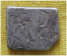 | Description / विवरण | It is an imperial type of coin. The shape of the coin is square. Obverse Sun, six armed chakra, crescent and other symbol is indistinct. Reverse Taurine. |
