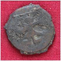 | Description / विवरण | The shape of the coin is circular. Obverse- - Kushana type king, standing with his right arm curved upward and left arm extended. Reverse- Probably the figure of MAO or Moon-God with his right arm curved upward and the crescent above the left shoulder. |
