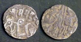 | Description / विवरण | Descrpn./Obv Recumbent bull facing left, wearing jhula (saddle cloth), with trisula (trident) symbol on rump. Above, legend in Sarada script Sri Samantadeva . Descrpn./Rev Rider with lance on caparisoned horse facing right. On left, Sarada letter bhi and on right, Sarada letter ta |