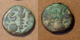 | Description / विवरण | Descrpn./Obv Stylised seated Goddess facing; Sharada legend, Ha (on l.) rsha ra (on r.). Descrpn./Rev Stylised standing king design; Sharada legend, jadeva (on r.) |