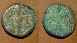 | Description / विवरण | Descrpn./Obv Stylised seated Goddess facing; Sharada legend, Ha (on l.) rsha ra (on r.). Descrpn./Rev Stylised standing king design; Sharada legend, jadeva (on r.) |