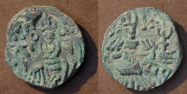 | Description / विवरण | Descrpn./Obv Stylised seated Goddess facing; Sharada legend, Ja (on l.), ga (on r.). Descrpn./Rev Stylised standing king design; Sharada legend, deva (on r.) |