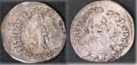 | Description / विवरण | Descrpn./Obv Zeus standing half left, holding winged Nike and long sceptre; Greek legend, Basileos Basileon Megalou / Azilisou. Descrpn./Rev Dioscuri, holding long spears and palms, mounted on horse galloping right, Kharoshthi legend, Maharajasa Rajadirajasa Mahatasa Ayilishasa |