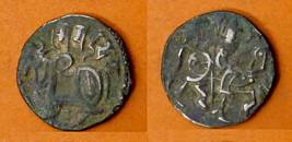 | Description / विवरण | Descrpn./Obv Recumbent bull facing left, wearing jhula (saddle cloth), with trisula (trident) symbol on rump. Above, legend in Sarada script Sri Samantadeva . Descrpn./Rev Rider with lance on caparisoned horse facing right. On left, Sarada letter bhi and on right, Sarada letter ta |