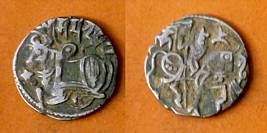 | Description / विवरण | Descrpn./Obv Recumbent bull facing left, wearing jhula (saddle cloth), with trisula (trident) symbol on rump. Above, legend in Sarada script Sri Samantadeva . Descrpn./Rev Rider with lance on caparisoned horse facing right. On left, Sarada letter bhi and on right, Sarada letter ta |