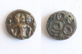 | Description / विवरण | On the obverse three headed Shiva standing staff in his right hand and kamandala in left hand is depicted. On the reverse Ujjayani symbol is depicted. |