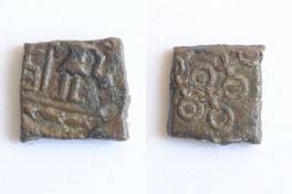 | Description / विवरण | On the obverse Shiva standing, head is out of flan, in right hand staff and kamandala in left hand, right side tree in railing and below fishes in river. On the reverse dotted one orbed Ujjayani symbol is depicted and cross in between the two orbed. |