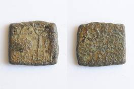 | Description / विवरण | On the obverse Bull standing in front of tree in railing, on its left side a standing figure of deity is depicted. On the reverse one orbed Ujjayani symbol is depicted. |