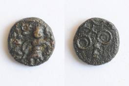 | Description / विवरण | On the obverse Shiva standing facing staff in right hand and kamandal in left hand on his upper right side makar symbol is depicted. On the reverse two orbed Ujjayani symbol is depicted. |