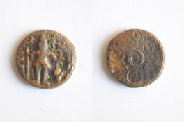 | Description / विवरण | On the obverse Shiva standing with Sun standard in right hand and kamandal in left hand. On the reverse two orbed Ujjayani symbol is depicted. |