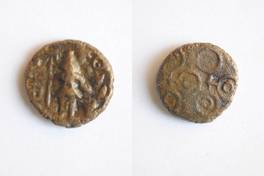 | Description / विवरण | On the obverse Shiva standing with Sun standard in right hand and kamandal in left hand, on his right side tree in railing and six armed symbol and two makar on left side. On the reverse two orbed Ujjayani symbol is depicted. |
