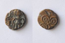| Description / विवरण | On the obverse Shiva standing with staff in right hand and kamandal in left, on his right side dhwaja and above six armed symbol is shown. On the reverse two orbed Ujjayani symbol is depicted. |