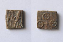 | Description / विवरण | On the obverse Shiva standing with spear in right hand and kamandal in left, on right side above makar, swastika and below is kapaldanda is depicted. On the reverse one orbed Ujjayani symbol, swastika in each orb is depicted. |