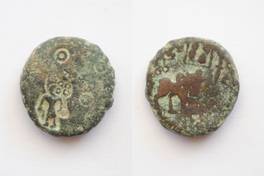 | Description / विवरण | Obverse is counter struck with symbols of Bull tank with fish, human figure and on the reverse Ujjayani symbol and human figure is depicted. |