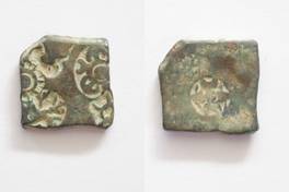 | Description / विवरण | On the obverse three arched hill with crescent, six spikes chakra, sun tree, seating bull are depicted. On the reverse Nandipada is depicted. |