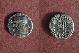 | Description / विवरण | On the obverse head of the King with date inscribed. On the reverse legend Rudrasen three arched hill river, Sun are depicted. |