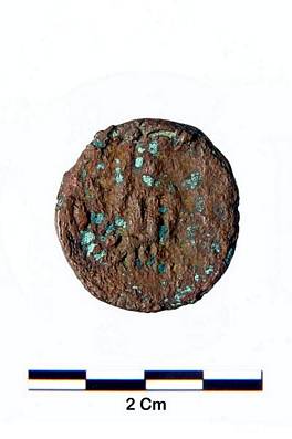 | Description / विवरण | Obverse- Female figure standing facing in the centre, tree on the right . Four dots and another indistinct symbol above on the left. Reverse- Indistinct. |