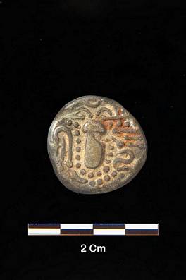 | Description / विवरण | Obverse Sivalinga type symbol with dots and lines. Reverse Three parallel lines Flanked by creseant shaped symbols in the center. Several dots and lines around it. |