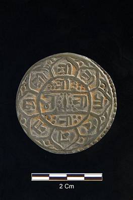 | Description / विवरण | Obverse Legend in square having the sun moon, star, Sir Sri Sri Rajender Vikram Saha Dev date 1746 below ornamental trident inside a circle in the centre. Reverse Legend inside central enrich Sri Sri Sri Bhawani around a dagger with wreath legend Sri Sri Sri Sri Gorakhnath around the circle with each syllable on one petal. |
