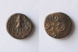 | Description / विवरण | On the obverse Shiva standing with spear in right hand and kamandal in left, on his right side tree in railing and six armed symbol on left side shown. On the reverse two orbed Ujjayani symbol is depicted. |