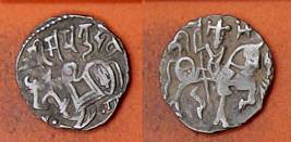 | Description / विवरण | Descrpn./Obv Recumbent bull facing left, wearing jhula (saddle cloth), with trisula (trident) symbol on rump. Above, legend in Sarada script Sri Samantadeva . Descrpn./Rev Rider with lance on caparisoned horse facing right. On left, Sarada letter bhi and on right, Sarada letter ta |