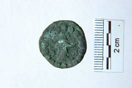 | Description / विवरण | Obverse- A border of dots. Symbols obliterated. Reverse- Bull standing facing right inside of dots. Crescent above his back. |