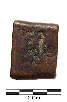 Thick punch marked rectangular copper coin Symbols on either side indistinct |