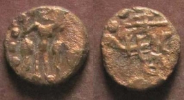 | Description / विवरण | Obverse - Kota in Brahmi, written vertically left wheal right trident. Reveres - Crude depiction of Siva standing with bull. |