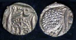 | Description / विवरण | Descrpn./Obv In the centre, a chhatra with Sa and Ta in Gurumukhi script on the left and right of its shaft; traces of the Persian legend seen on the obverse of the bigger Nanakshahi coins of Amritsar mint are also seen. Descrpn./Rev Big peepal leaf and traces of the Persian legend seen on the reverse of the bigger Nanakshahi coins of Amiritsar mint - Shri Amritsarjiv zarb [VS Year] Takht maimanat julus manus Akal Bakht. Especially traces of alif of Akal and te of Takht and maimanat are seen |