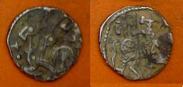 | Description / विवरण | Descrpn./Obv Recumbent bull facing left, wearing jhula (saddle cloth), with trisula (trident) symbol on rump. Above, legend in Sarada script Sri Samantadeva . Descrpn./Rev Rider with lance on caparisoned horse facing right. On left, Sarada letter bhi and on right, Sarada letter ta |