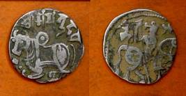 | Description / विवरण | Descrpn./Obv Recumbent bull facing left, wearing jhula (saddle cloth), with trisula (trident) symbol on rump. Above, legend in Sarada script Sri Samantadeva . Descrpn./Rev Rider with lance on caparisoned horse facing right. On left, Sarada letter bhi and on right, Sarada letter ta |