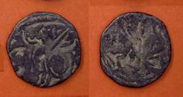 | Description / विवरण | Descrpn./Obv Recumbent bull facing left, wearing jhula (saddle cloth), with trisula (trident) symbol on rump. Above, legend in Sarada script Sri Samantadeva . Descrpn./Rev Rider with lance on caparisoned horse facing right. On left, Sarada letter bhi and on right, Sarada letter ta |