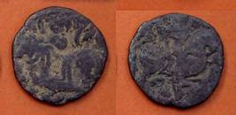 | Description / विवरण | Descrpn./Obv Recumbent bull facing left, wearing jhula (saddle cloth), with trisula (trident) symbol on rump. Above, legend in Sarada script Sri Samantadeva . Descrpn./Rev Rider with lance on caparisoned horse facing right. On left, Sarada letter bhi and on right, Sarada letter ta |
