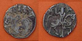 | Description / विवरण | Descrpn./Obv Recumbent bull facing left, wearing jhula (saddle cloth), with trisula (trident) symbol on rump. Above, legend in Sarada script Sri Samantadeva . Descrpn./Rev Rider with lance on caparisoned horse facing right. On left, Sarada letter bhi and on right, Sarada letter ta |