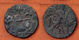 | Description / विवरण | Descrpn./Obv Recumbent bull facing left, wearing jhula (saddle cloth), with trisula (trident) symbol on rump. Above, legend in Sarada script Sri Samantadeva . Descrpn./Rev Rider with lance on caparisoned horse facing right. On left, Sarada letter bhi and on right, Sarada letter ta |
