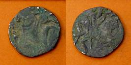 | Description / विवरण | Descrpn./Obv Recumbent bull facing left, wearing jhula (saddle cloth), with trisula (trident) symbol on rump. Above, legend in Sarada script Sri Samantadeva . Descrpn./Rev Rider with lance on caparisoned horse facing right. On left, Sarada letter bhi and on right, Sarada letter ta |