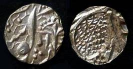 | Description / विवरण | Descrpn./Obv In the centre, a chhatra with Sa and Ta in Gurumukhi script on the left and right of its shaft; traces of the Persian legend seen on the obverse of the bigger Nanakshahi coins of Amritsar mint are also seen. Descrpn./Rev Big peepal leaf and traces of the Persian legend seen on the reverse of the bigger Nanakshahi coins of Amiritsar mint - Shri Amritsarjiv zarb [VS Year] Takht maimanat julus manus Akal Bakht. Especially traces of alif of Akal and te of Takht and maimanat are seen |