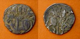 | Description / विवरण | Descrpn./Obv Recumbent bull facing left, wearing jhula (saddle cloth), with trisula (trident) symbol on rump. Above, legend in Sarada script Sri Samantadeva . Descrpn./Rev Rider with lance on caparisoned horse facing right. On left, Sarada letter bhi and on right, Sarada letter ta |