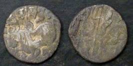 | Description / विवरण | Descrpn./Obv Recumbent bull facing left, wearing jhula (saddle cloth), with trisula (trident) symbol on rump. Above, legend in Sarada script Sri Samantadeva . Descrpn./Rev Rider with lance on caparisoned horse facing right. On left, Sarada letter bhi and on right, Sarada letter ta |