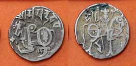 | Description / विवरण | Descrpn./Obv Recumbent bull facing left, wearing jhula (saddle cloth), with trisula (trident) symbol on rump. Above, legend in Sarada script Sri Samantadeva . Descrpn./Rev Rider with lance on caparisoned horse facing right. On left, Sarada letter bhi and on right, Sarada letter ta |