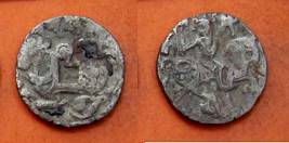 | Description / विवरण | Descrpn./Obv Recumbent bull facing left, wearing jhula (saddle cloth), with trisula (trident) symbol on rump. Above, legend in Sarada script Sri Samantadeva . Descrpn./Rev Rider with lance on caparisoned horse facing right. On left, Sarada letter bhi and on right, Sarada letter ta |