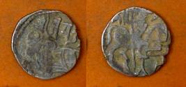 | Description / विवरण | Descrpn./Obv Recumbent bull facing left, wearing jhula (saddle cloth), with trisula (trident) symbol on rump. Above, legend in Sarada script Sri Samantadeva . Descrpn./Rev Rider with lance on caparisoned horse facing right. On left, Sarada letter bhi and on right, Sarada letter ta |