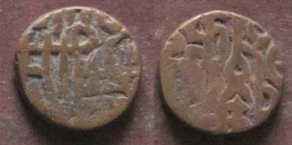 | Description / विवरण | Obverse - Seated bull to left partly Worn out. Reverse - Horse with rider to right, partly Worn out. |