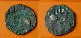 | Description / विवरण | Descrpn./Obv Recumbent bull facing left, wearing jhula (saddle cloth), with trisula (trident) symbol on rump. Above, legend in Sarada script Sri Samantadeva . Descrpn./Rev Rider with lance on caparisoned horse facing right. On left, Sarada letter bhi and on right, Sarada letter ta |